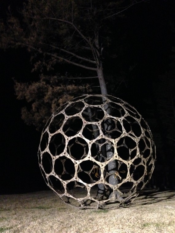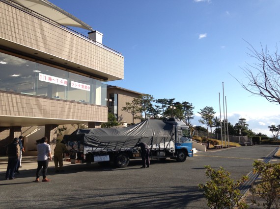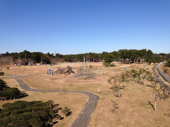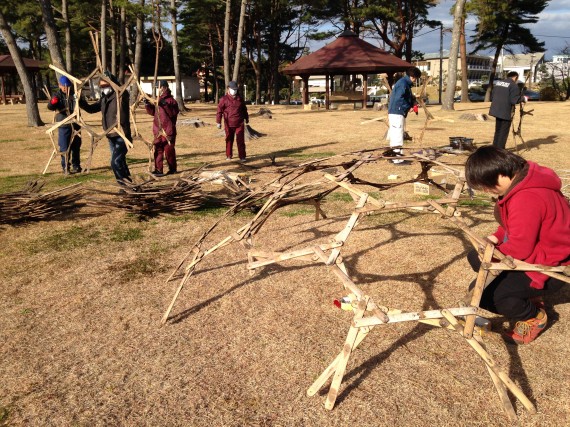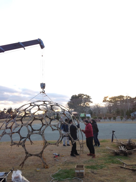 バンブースフィアin福島 - 初日 Category:アート Date:2015年12月08日 仙台空港にやって来ました。 2ヶ月前に東京渋谷のアートイベントで展示した光る竹球「バンブースフィア」を、今回は福島楢葉町の復興イベントで展示します。 仙台空港からは最近開通した高速道路を通っての車移動。宿泊先のいわき市まで行きます。が、 福島第一原発から最も近いところで6kmぐらいの地点を通過しながら南下していくので、大丈夫とは分かっていても正直ちょっと怖い。 第一原発の近くにさしかかると道路脇に線量を表示する電光掲示板があって 「4.2」 と光ってます。 案内してくれた方が、「0.2が自然界の正常値だよ」 と教えてくれてさらにビビる。 でも通過するだけなら何も問題ないそうです。 福島がフクシマになってからもうすぐ5年。 原発の事故さえなければ今頃復興されて夜でも煌々と光っているはずの街は、とにかく真っ暗でした。何か色んなことを考えさせられますね。。。 翌日、作業初日、第一原発から約17km地点の楢葉町の天神岬スポーツ公園へ。 隣の富岡町は大部分が居住制限区域で、まだ人が住めないんですが、楢葉は除染作用も進んでこの9月に解除になったそうです。 しかしこの公園、かなり広い。 海に面していて北側は断崖絶壁。なかなかの絶景です。 向こうに見えるのは多分第二原発の堤防ですね。 南側には広野火力発電所。 このあたりは発電所多いですね。よく見ると海岸線復興工事してます。 昨日、部品やら荷物やらを載せて阿南を出たトラックが公園に到着。 さっそく組立作業に 地元の方々と、東京電力の方々が手伝ってくれました。 おかげで予定よりはやく進んでいきます。 13時に組み立てを開始して16時にはこの状態。 19時にとりあえず球体が完成。これ一人でコロコロ転がせるんです。わりと丈夫な設計。 ということは、風に煽られると勝手にどこ転がっていくか分からないので、一時的に松にくくりつけて固定。 これで本日の作業は終了。明日も朝から作業です。 PR