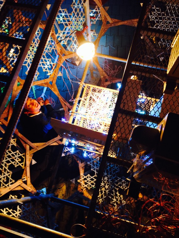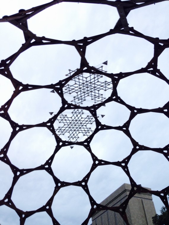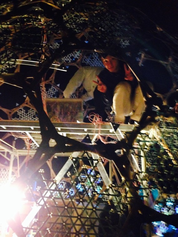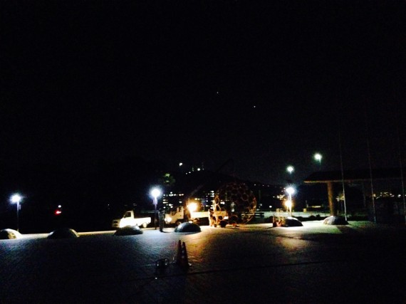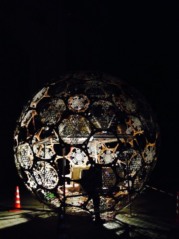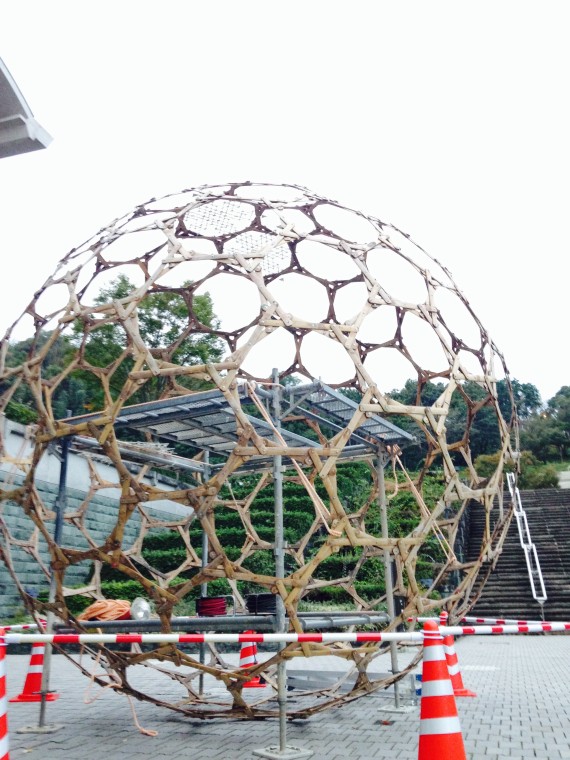 文化の森にバンブースフィア Category:アート Date:2016年10月31日 昨日の夜文化の森で あのいつもの竹の球体を組んできました。 もう慣れたもんですよ。通算制作数そろそろ20体に近くなってきたんでw 1日くれたら一人で組めます。 でも昨日は4人もメンバーがいたんで、みんなの仕事終わりからチャチャっと組むことになりました。 21世紀館の前から。後ろにぼんやり見える山のラインは眉山のそれ。 22時ぐらいに組み終わりました。4人おったらやっぱはやい! で、一夜明けて今日。 LEDの基盤を取り付けにやってきました。 でーーん。 渋谷で宙吊りにしたときも球の形は綺麗だったんですが、今回のは更に綺麗に仕上がってます。 地面に置くと重みで下が潰れる。宙吊りにすると若干縦に伸びる。両方とも重力の仕業。 中に足場があるのは見た目的にイマイチですが、その足場から放射状に引っ張りあげるとこの様に完全な球体の形を保ったままある程度の期間展示できる! こんな感じでLEDの基盤を取り付けていきます。が、ただいまお一人様です。 ぼっち作業というのは嫌ですね。話相手もいないのでついつい缶コーヒー買ってボーーーっとする回数が増えます。 誰もいない文化の森。。。そう、今日は休館日。。。 とりあえず基盤だけつけて今日は帰ろーと思ったら 配線しに3人も!あと文化の森の公園管理の方も一人来てくれた! ありがとうございますm(__)m ん・・・? つまり今日で完成させるってことね。配線終わらすんね。 ということで、超絶ハード音痴+電気系スキルゼロの僕も点灯テストまで残ることに。。。 初めて電気系の作業に参加。 いやぁー竹組むのは高度な専門知識持ってるんですけどね、こっから先はみんなの話についていけず・・・ 関西は60、関東は50?今回の分電機徳島設定?分けたら電圧足りる? とかみんな言ってますが、僕は終始ゴルゴ13のように「・・・・・・。」 で配線束ねるとか電気Lv.1の作業をしてました。 でその後、この写真撮ってふと思ったんだが あれ?基盤で光らす以外にこの球の見せ方まだまだあるぞ と 何かおもしろい画ではないですか!?何か貼ってライトアップとか・・・ と色々考えている内に配線完了。 無事点灯。 おすすめは21世紀館からコロッセオに上がる階段の上から見るのが一番綺麗です。 写真ボカしてんのは現地に見に来てというメッセージ以外の何ものでもありません。 点灯は11/3から11/23まで。 11/3に「文化の森大秋祭り」というイベントがあるのでそれに合わせての点灯です。 文化の森6館がそれぞれ色んな催しを企画していますので、気になる方は文化の森まで足を運んでください。 PR
